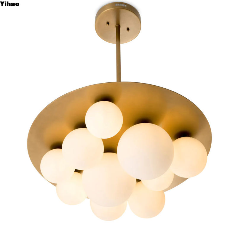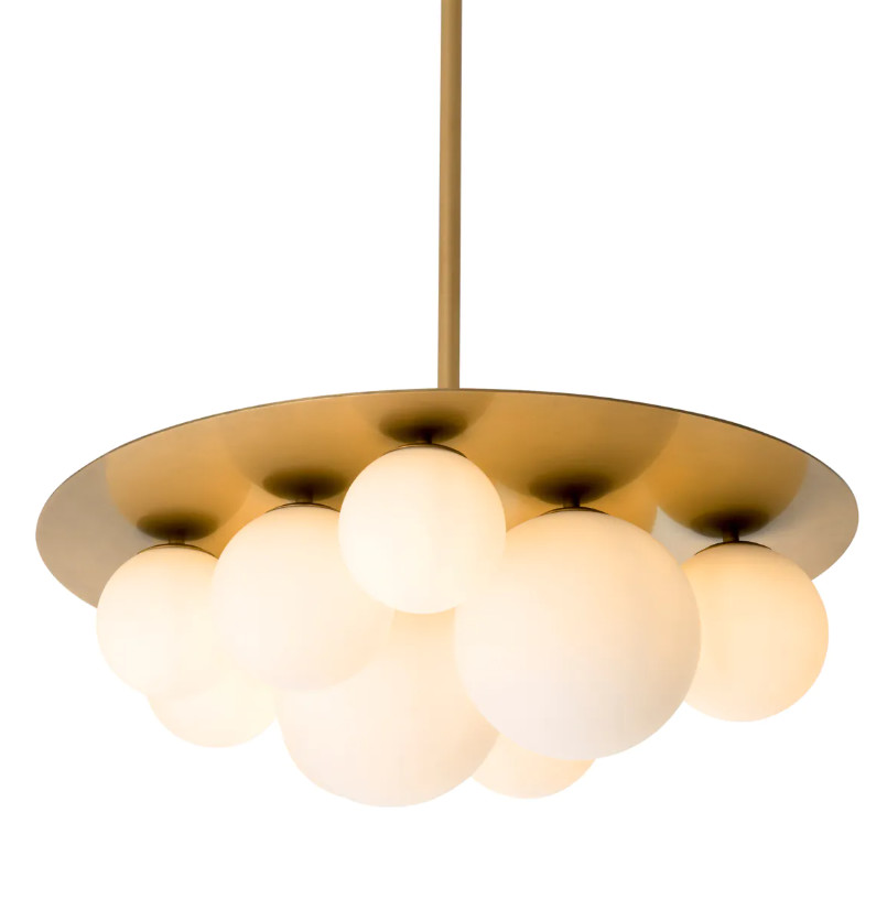 Its white glass globes and antique brass finish fuse to create an exclusive pendant, reflecting a timeless luxury that complements any elegant interior design.